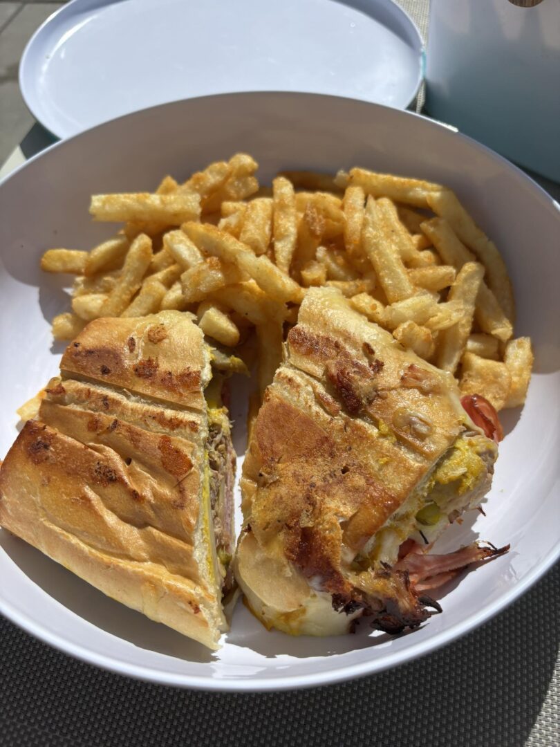 Once we landed in Miami, we grabbed an Uber to our hotel—the Marriott Biscayne Bay! It’s right on the water and super close to the port. There’s even a little market connected to the hotel. The pool is a good size, and the Cuban sandwich and Caesar salad were amazing. (And if you know hotel food… when I say it’s amazing, you should believe me 😂). We ended the night at an Irish pub next door. I didn’t get any pictures 🤪 but the chicken dinner was very good, and I did try to get a photo of the Virgin port.